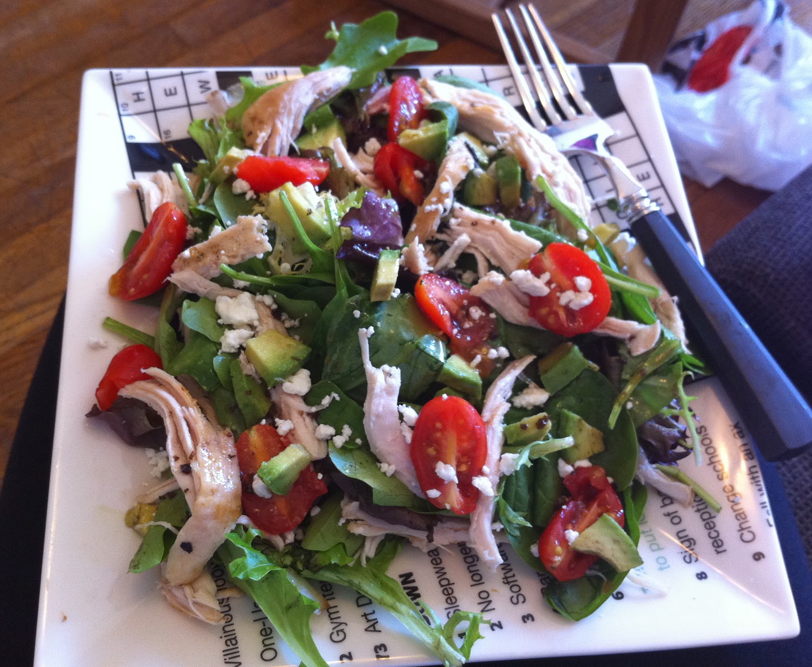Today has not been particularly exciting. I cleaned and did some cooking in the morning after my one class. I had a pretty salad of spinach, tomatoes, avocado, chicken, and goat cheese (yum mom!) on my cool New York Times crossword plate.